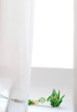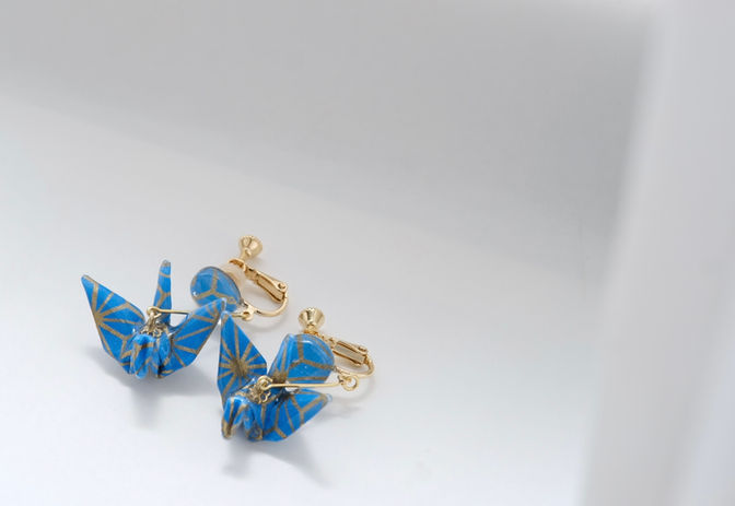 アクセサリーの折り鶴は、羽の先端が皮膚に当たって痛くならないよう、羽の広げ方に特徴があります。さらに、耳に装着した時に鶴が正面を向くように、左右で角度を保たせる工夫も施しています。